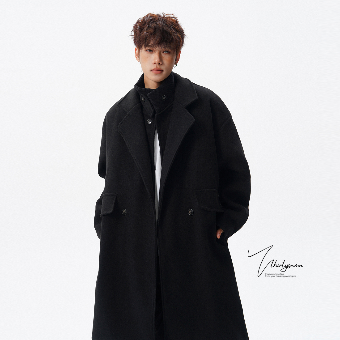 A SUCCESSFUL DAY|假两件长款毛呢大衣男冬外套潮加厚双排扣风衣