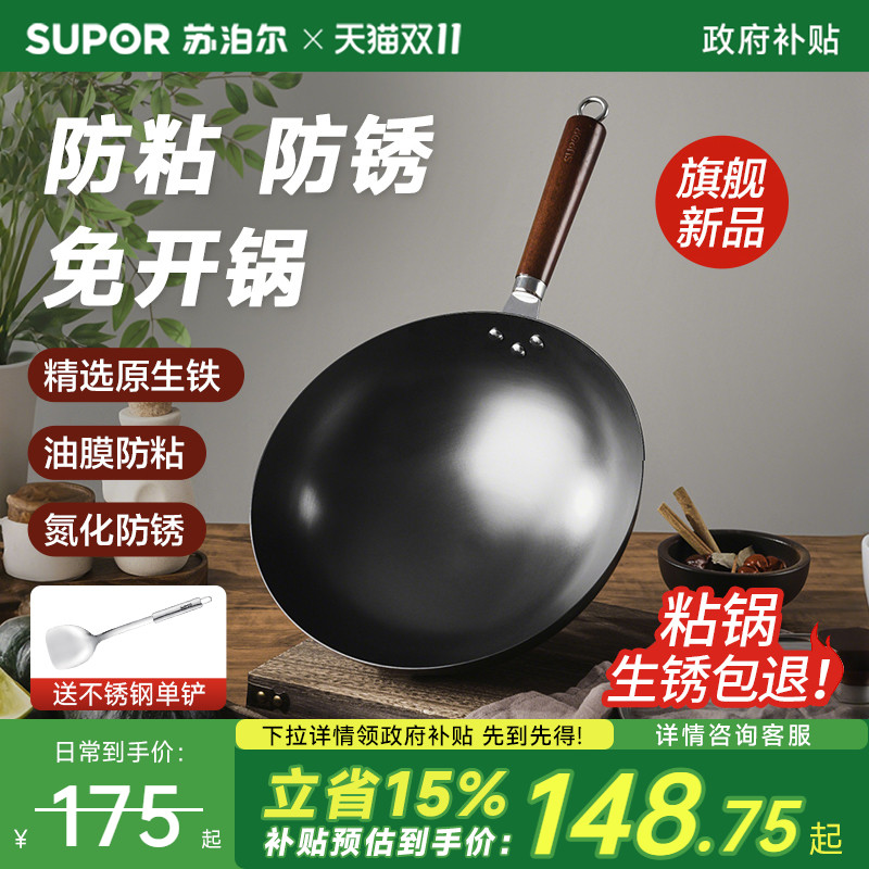 苏泊尔铁锅炒锅家用老式炒菜锅无涂层电磁炉燃气灶通用锅具免开锅