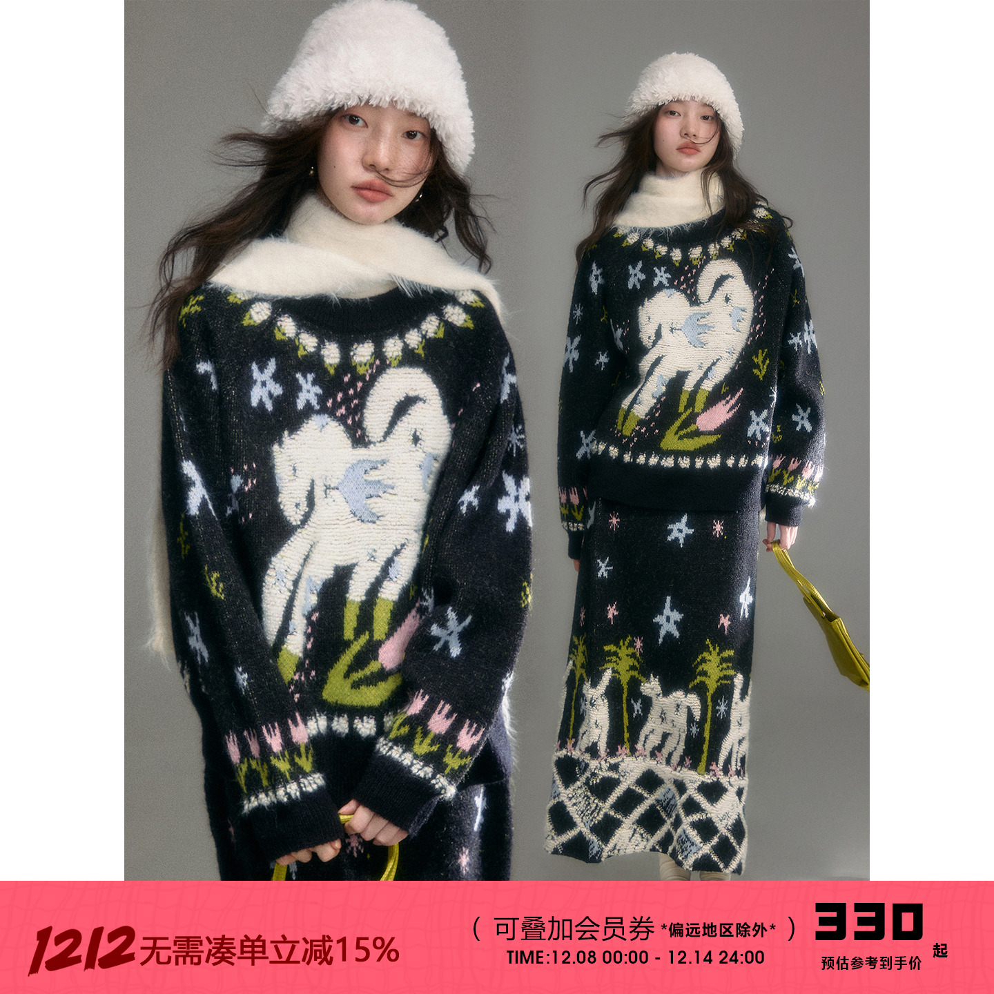有耳uare原创设计 小马寻梦环游记 动物提花羊毛混毛衣半身裙套装