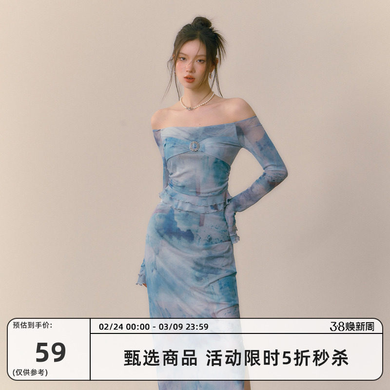RedBling 原创设计晕染网纱套装一字肩上衣辣妹包臀裙秋季新款女