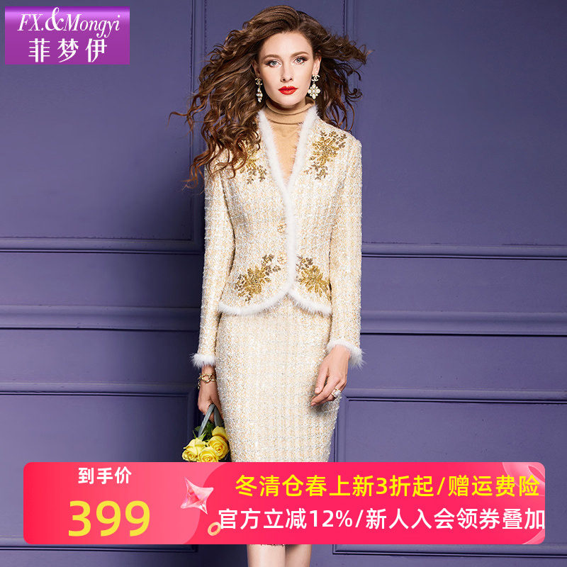 菲梦伊水貂毛小香风套装女秋季高端加厚粗花呢外套包臀半裙两件套