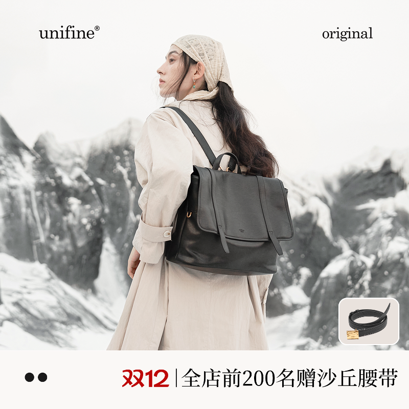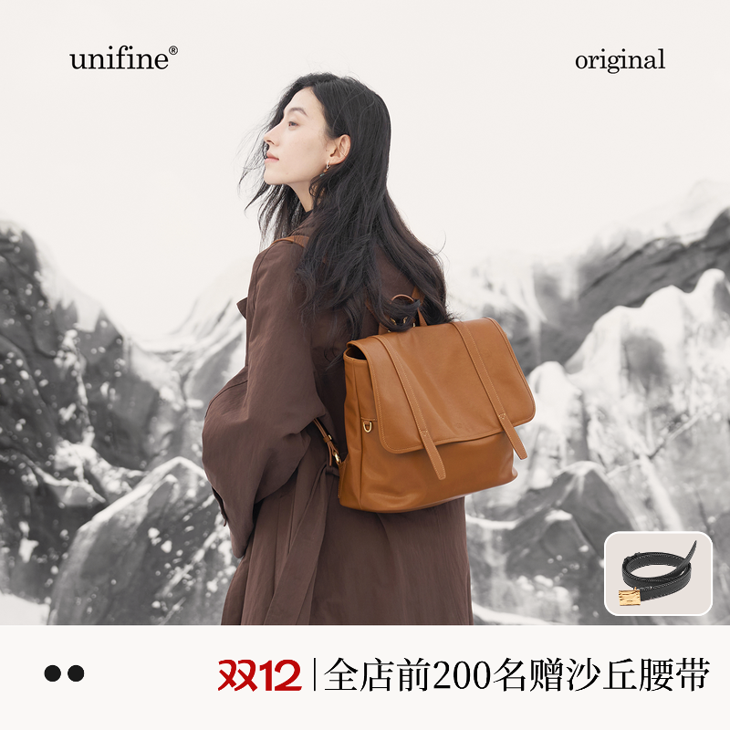 unifine川行头层真皮牛皮双肩包女秋冬新款小众背包单肩斜挎包