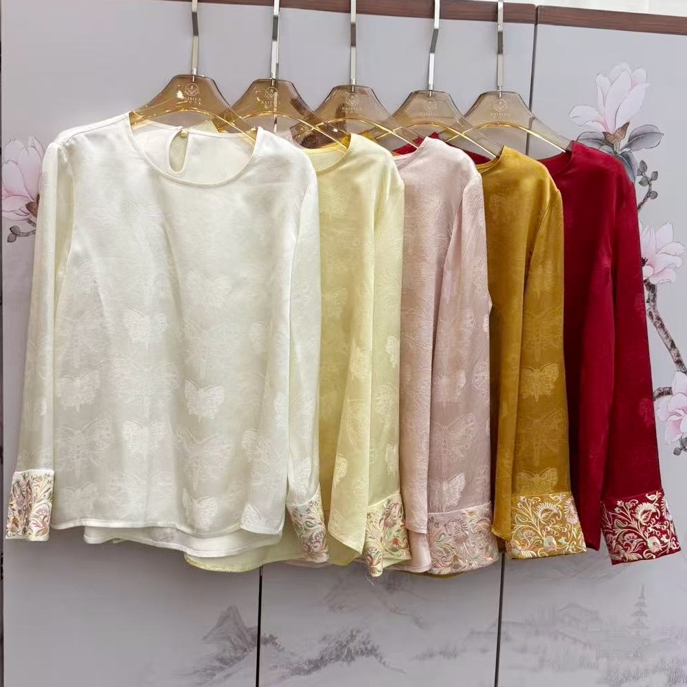 2026春时尚复古醋酸提花刺绣新中式纯色圆领上衣通勤绣花蝴蝶衬衫