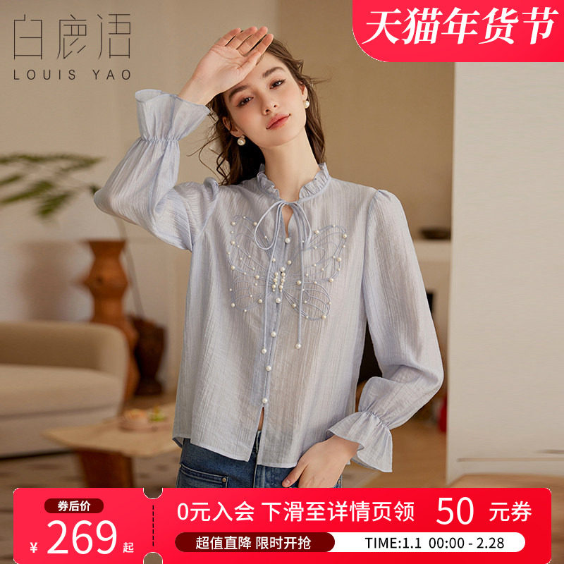 白鹿语甜美花边立领系带衬衣2025春季新款设计感钉珠蝴蝶衬衫女