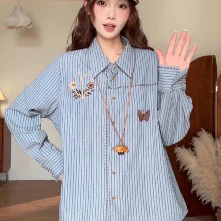 新中式国风刺绣蝴蝶衬衫女2025春季洋气设计感复古显瘦减龄打底衫
