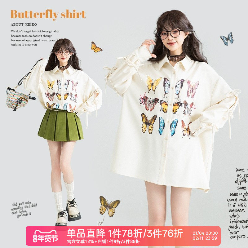 KEIKO 文艺感蝴蝶图案印花白色衬衫女25早秋出游宽松休闲外套