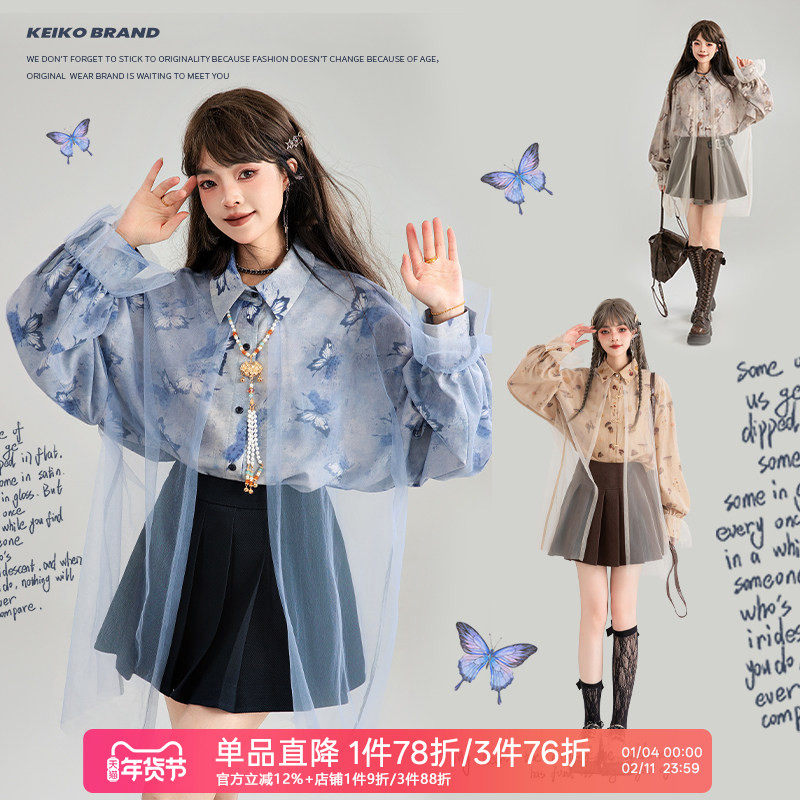 KEIKO 晕染蝴蝶花长袖衬衫女2026春季气质朦胧轻纱拼接宽松上衣