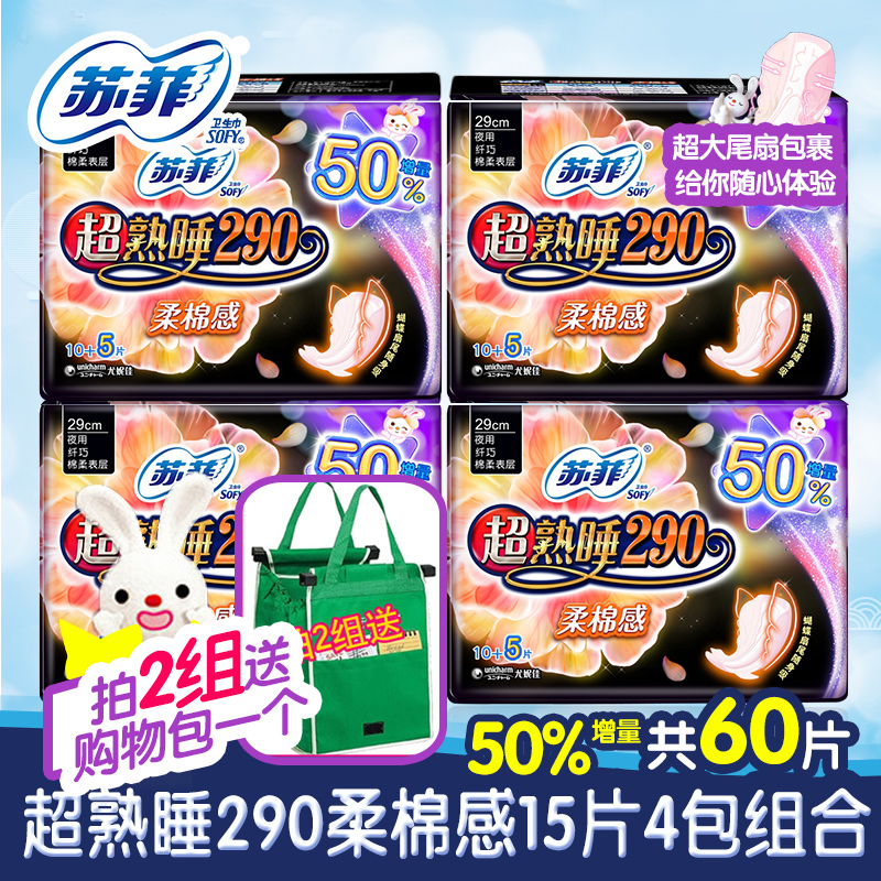 正品苏菲卫生巾 棉柔超熟睡290夜用60片姨妈巾组合装整箱女姨妈巾