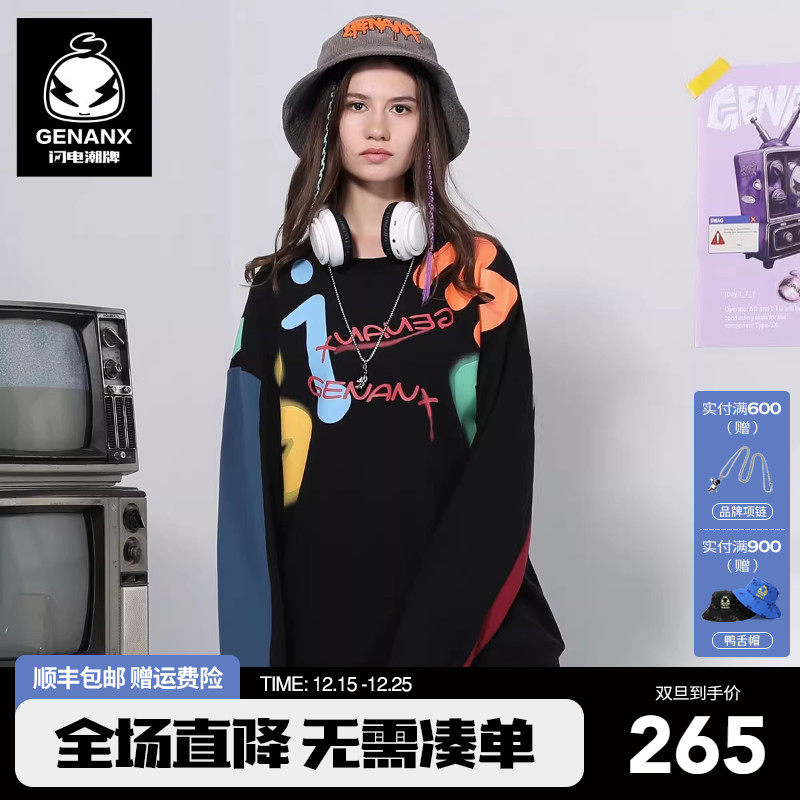 GENANX闪电潮牌卫衣女不对称撞色拼接袖炫彩字母印花圆领上衣