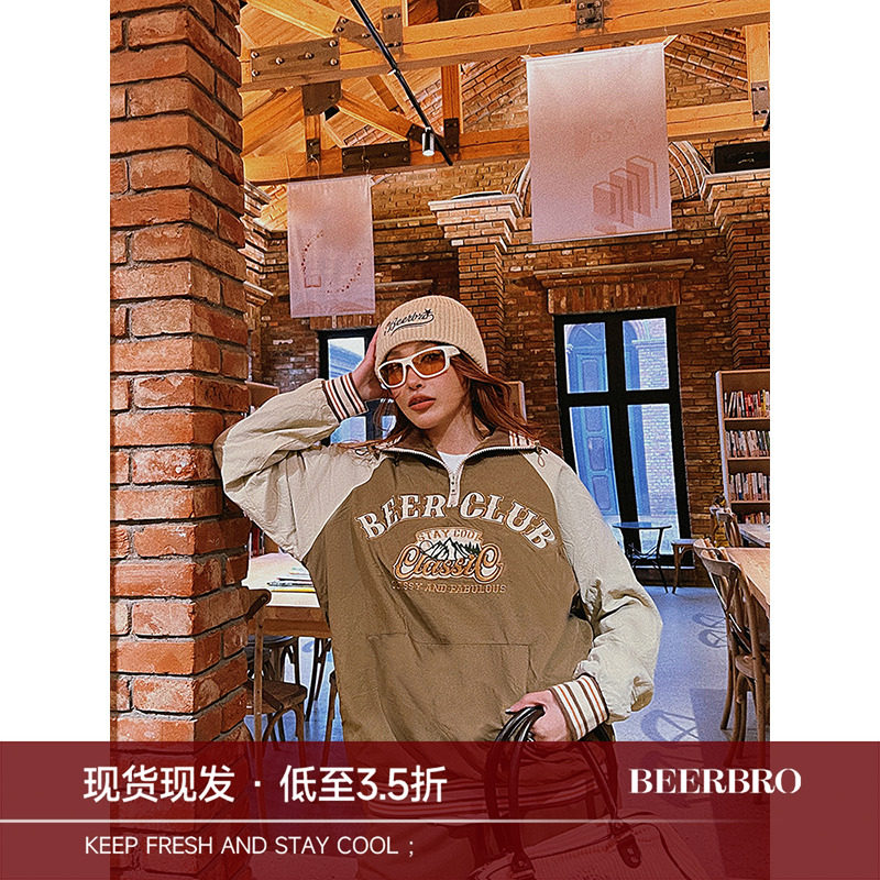 BeerBro美式vintage潮牌卫衣女秋冬2023新款宽松撞色休闲风上衣
