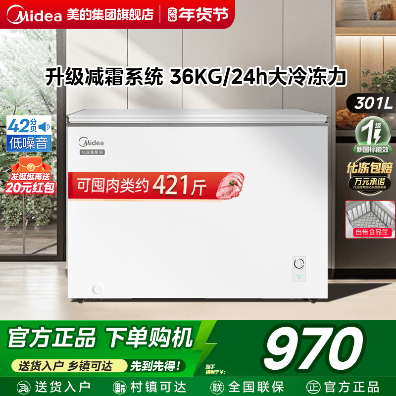 美的301L大容量冰柜家用商用两用冷柜卧式全冷冻冷藏减霜大型冰箱
