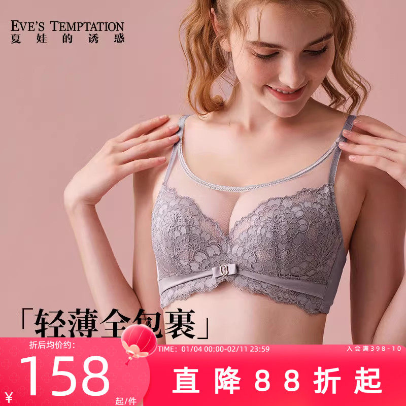 夏娃的诱惑内衣女大胸显小全罩杯薄杯蕾丝防下垂收副乳抹胸式文胸