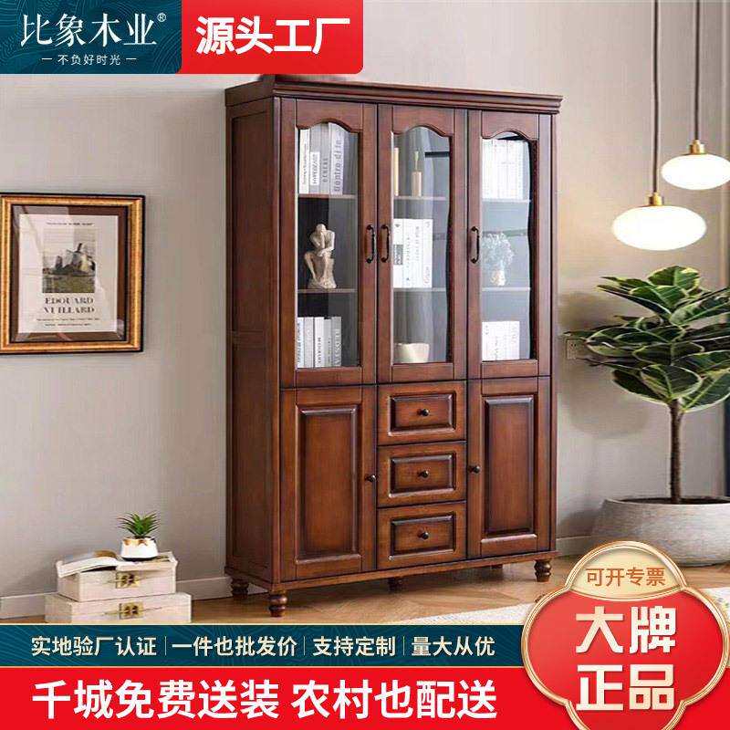 美式实木书柜简约风书橱书架家用带玻璃门落地客厅酒柜置物储物柜