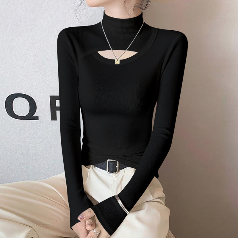 黑色半高领打底衫女秋冬内搭镂空破洞长袖t恤高级感螺纹针织上衣