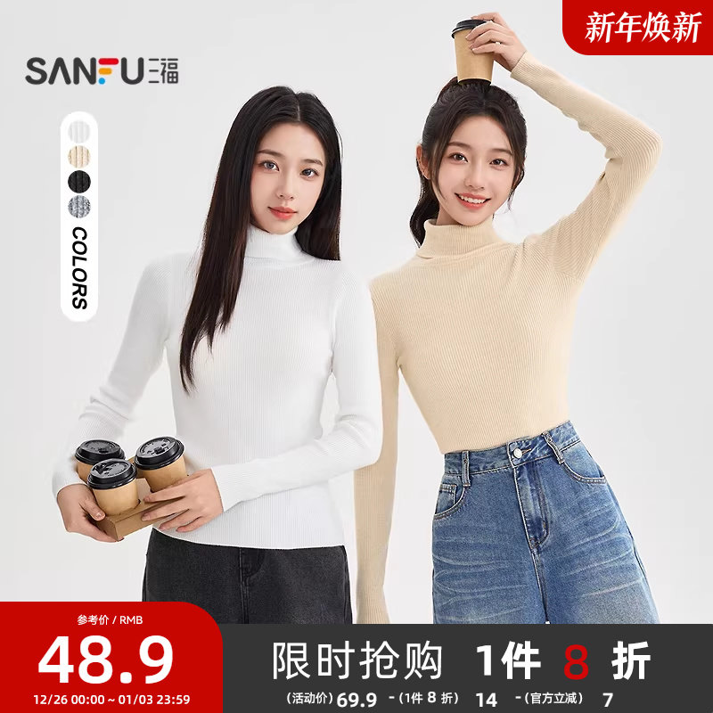 三福高领打底衫女2025新款时尚内搭毛针织衫修身显瘦黑色上衣女装