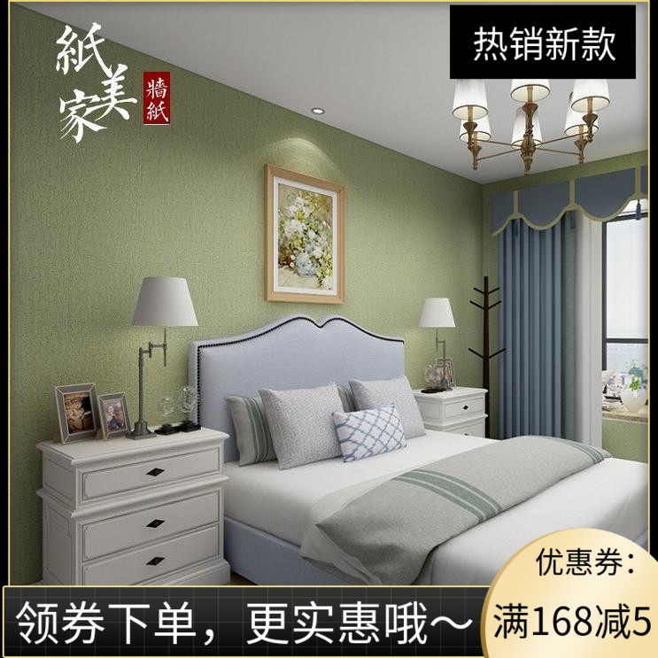 小清新绿色墙纸 纯色壁纸 无纺布蚕丝 客厅卧室现代简约 复古绿