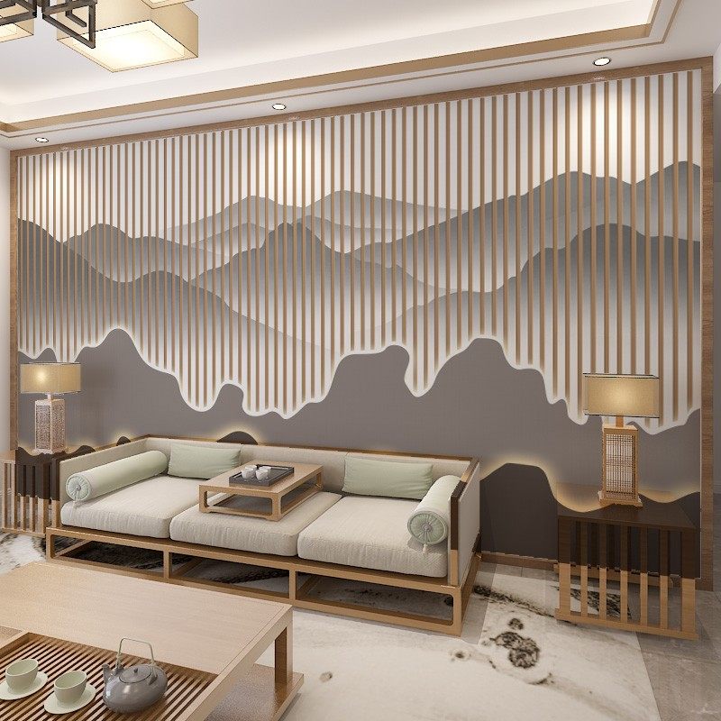 新中式墙纸装修木格栅山水电视背景墙布采耳养生会所壁画茶室壁纸