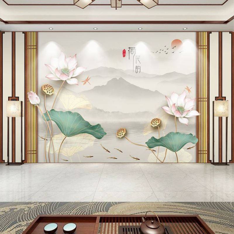 新中式墙纸九鱼图荷花电视背景墙壁纸山水壁画3d立体墙布2024新款
