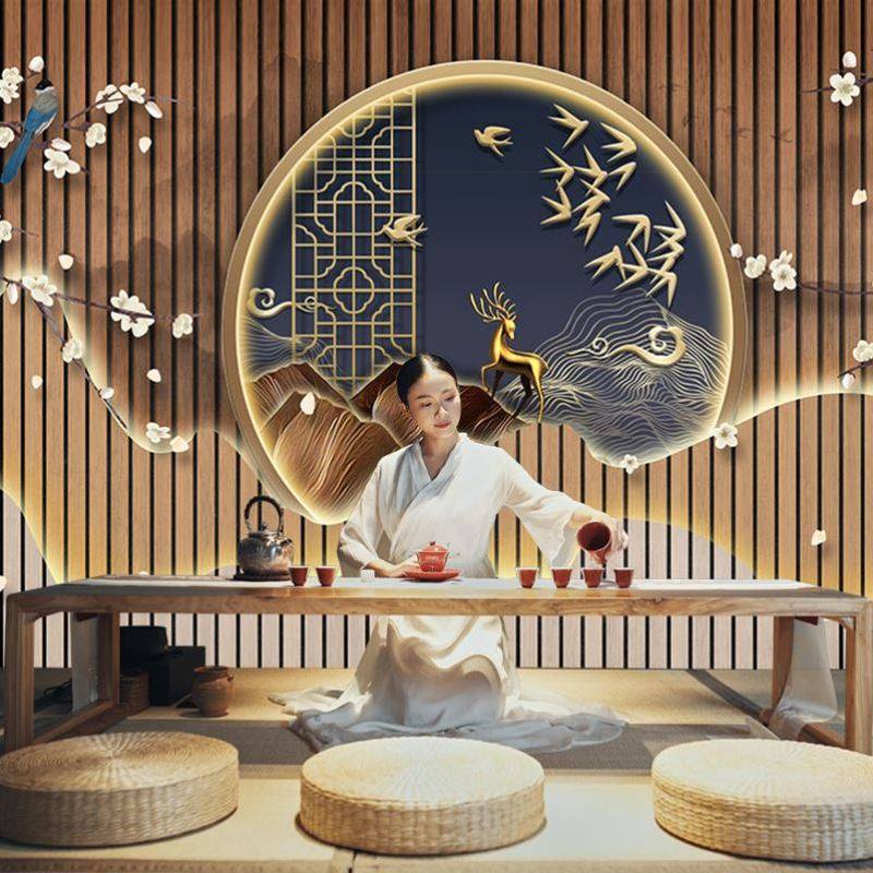 新中式墙纸茶室背景墙装饰直播间茶叶禅意古典采耳店足疗大厅壁纸