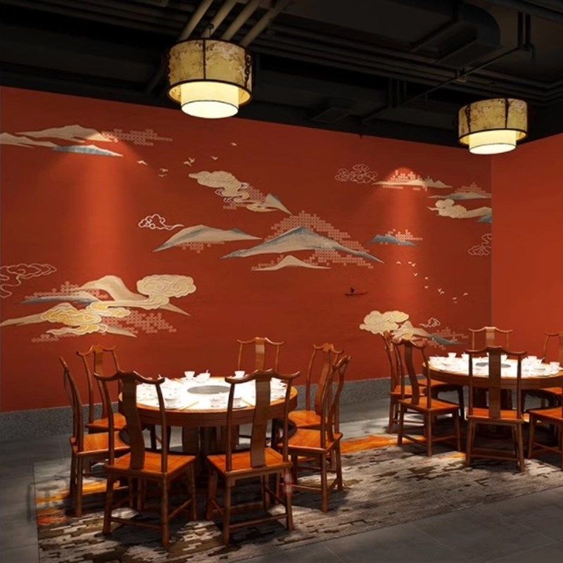 新中式中国风格墙纸自粘祥云饭店餐厅贴纸酒店大红色墙贴自贴壁纸