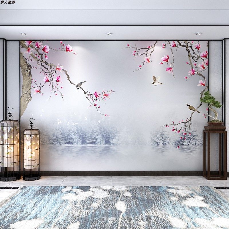 8d新中式墙纸客厅电视背景墙布沙发影视墙布装饰花鸟大气无缝壁布