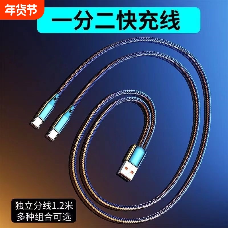 一拖二数据线二合一充电器线适用USB车载1分2双头苹果16iphone15荣耀OPPO一加闪充华为typec手机100W超级快充