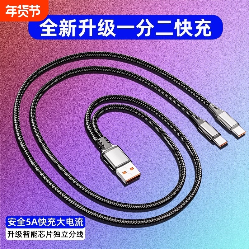 一拖二充电线二合一5A快充编织线数据线闪充加长2米适用双华为苹果安卓typec小米车载通用独立分线多头