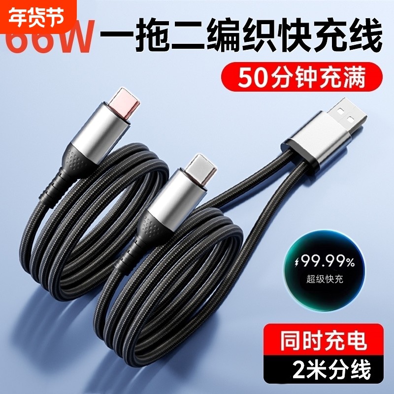 66W一拖二数据线超级快充适用双华为Typec苹果17安卓小米oppo荣耀二合一闪充加长2米车载同时充