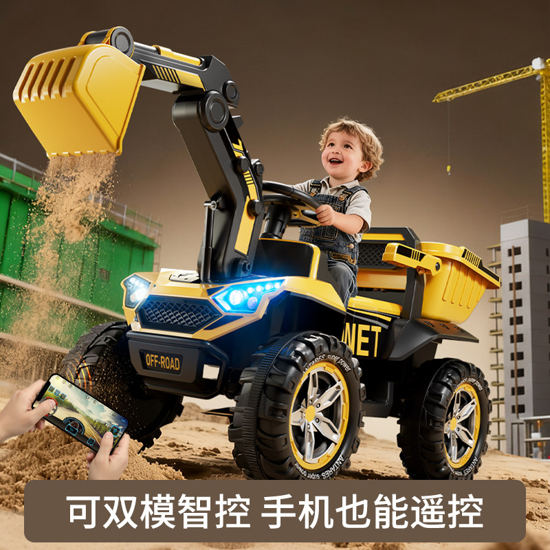 新款儿童电动挖掘机男孩玩具车小孩可坐人可遥控勾土机四轮工程车