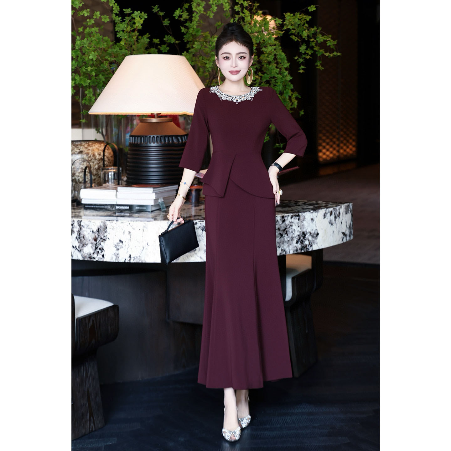 高端烫钻晚宴优雅复古宴会婚礼晚宴丝绒订珠修身鱼尾长裙连衣裙女