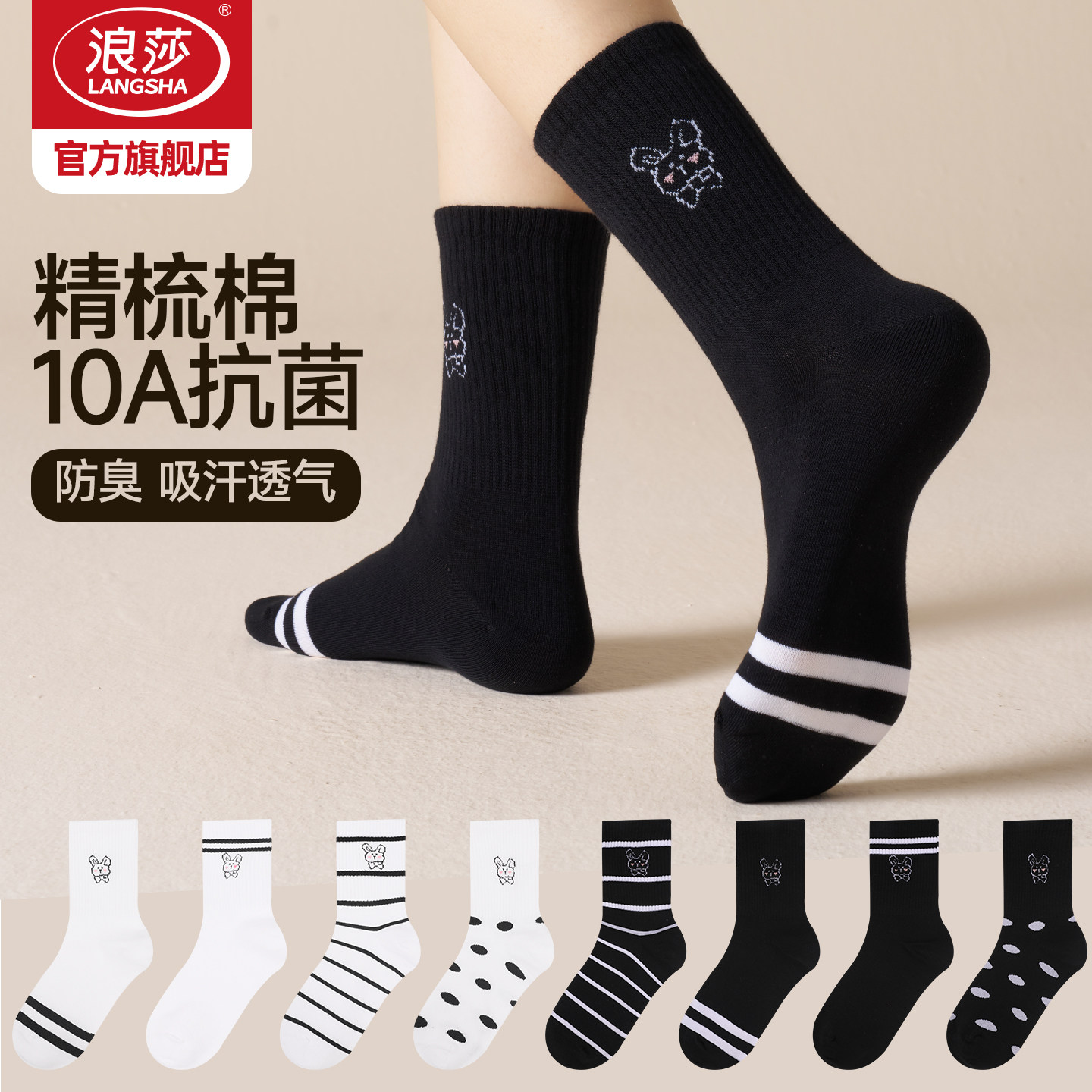 浪莎白色袜子女中筒袜纯棉女袜全棉防臭吸汗学生袜春秋季短袜秋冬