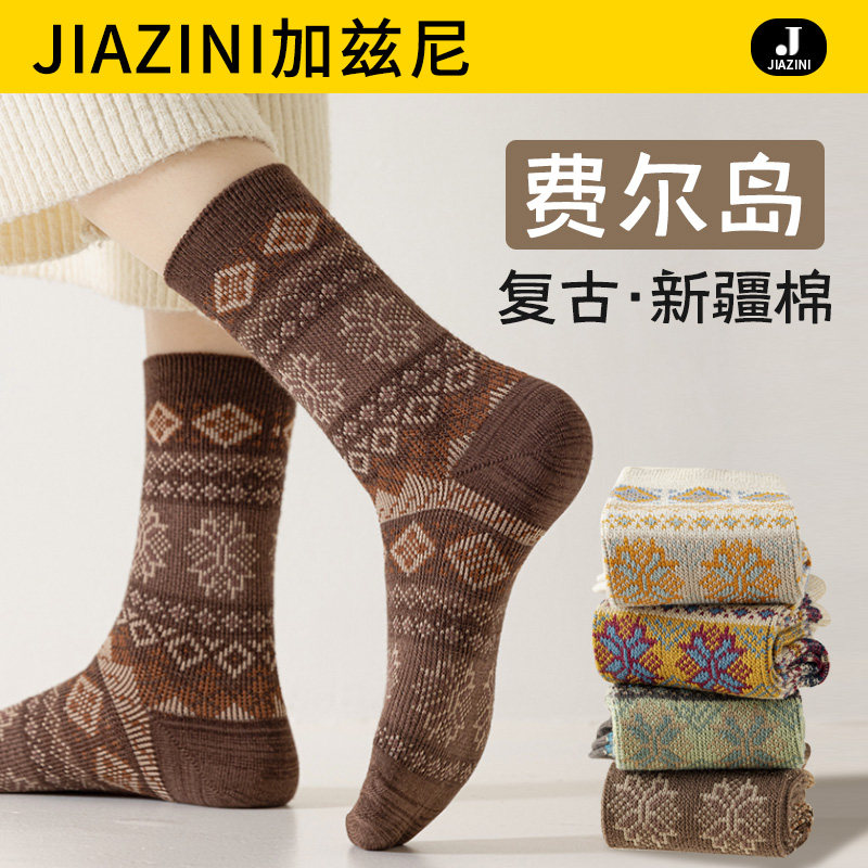 复古费尔岛袜子冬加厚纯棉女袜2026新款爆款中筒袜民族风咖色长袜