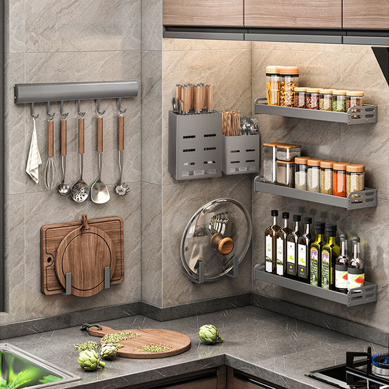 枪灰厨房置物架免打孔多功能壁挂调料品组合调料盒筷子刀架收纳架