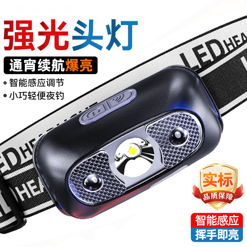 感应头灯强光充电超亮头戴式夜钓鱼照明户外超长续航超轻小手电筒