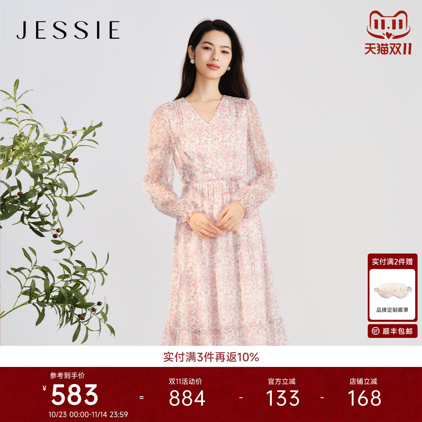 JESSIE减龄粉色碎花V领中长款雪纺连衣裙春新款系带收腰显瘦长袖