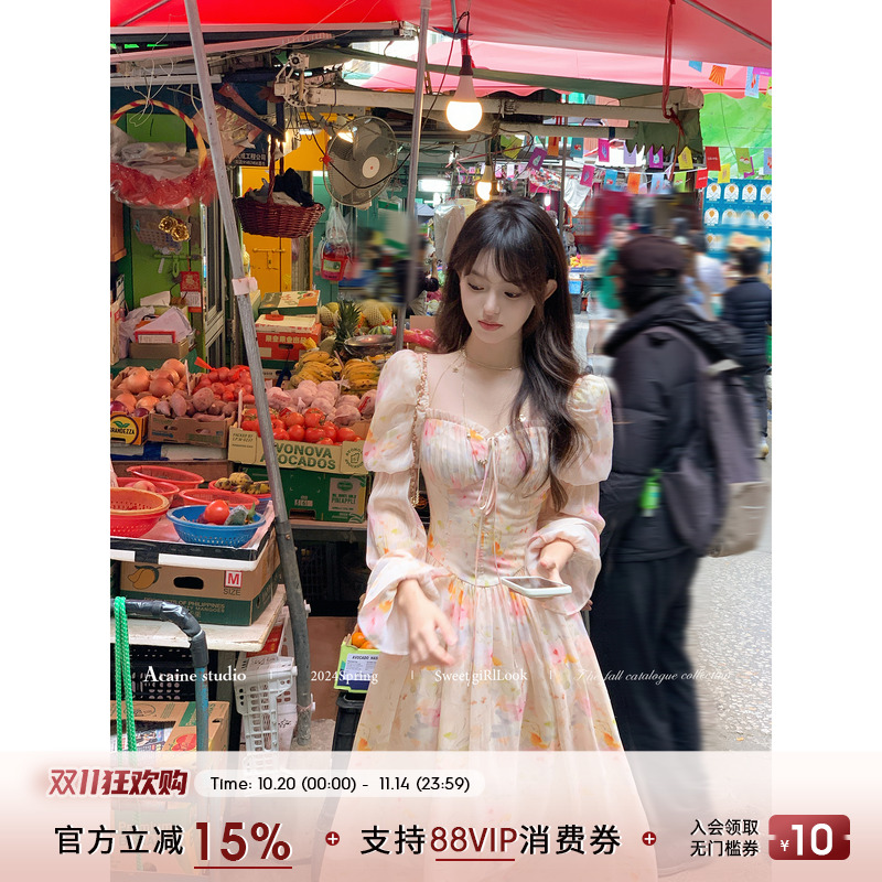 【现货】Acaine长款方领泡泡袖碎花长袖雪纺连衣裙女秋季法式裙子