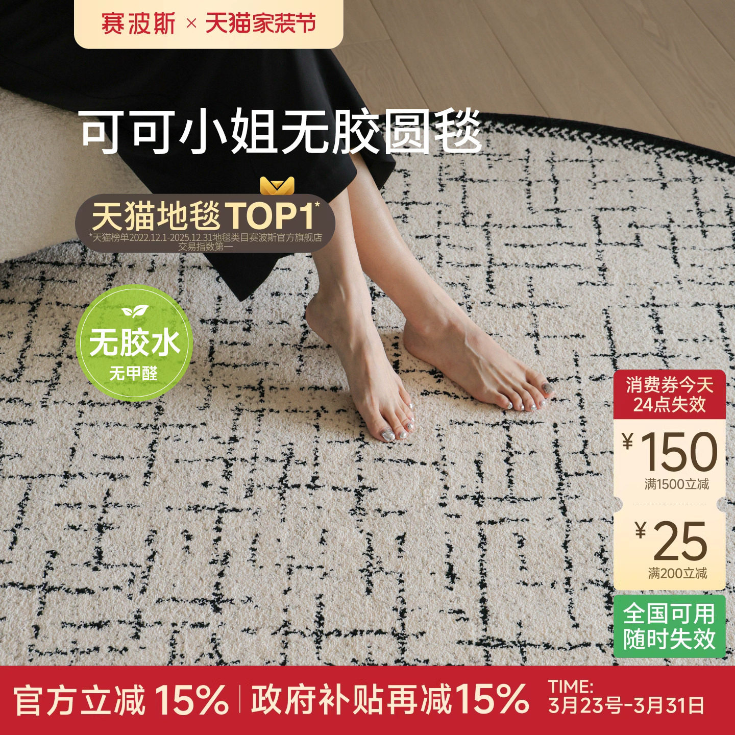 赛波斯人气同款! 法式轻奢圆形地毯无胶防水客厅卧室床边毯衣帽间