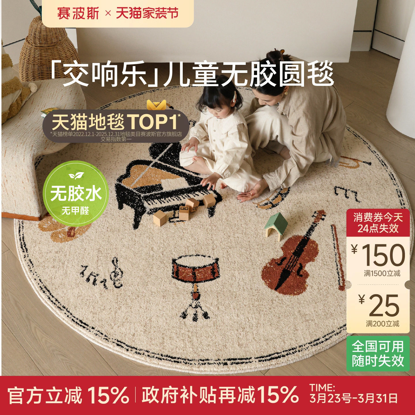 赛波斯「交响乐」无胶圆形地毯儿童房娱乐区防水抑菌琴房书房床边