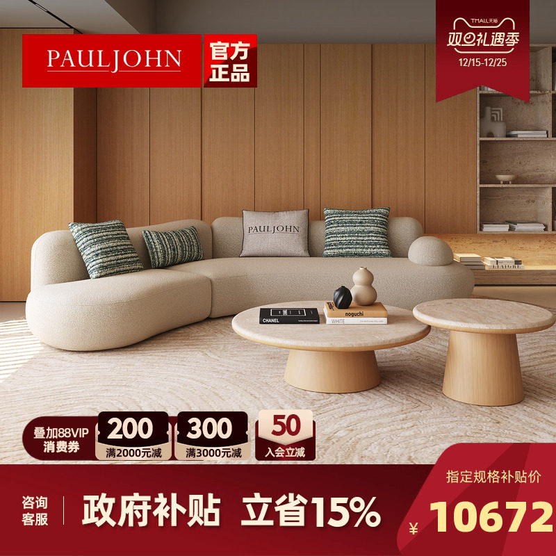 PAULJOHN意式轻奢弧形布艺沙发别墅平层客厅进口棉麻羽绒转角沙发
