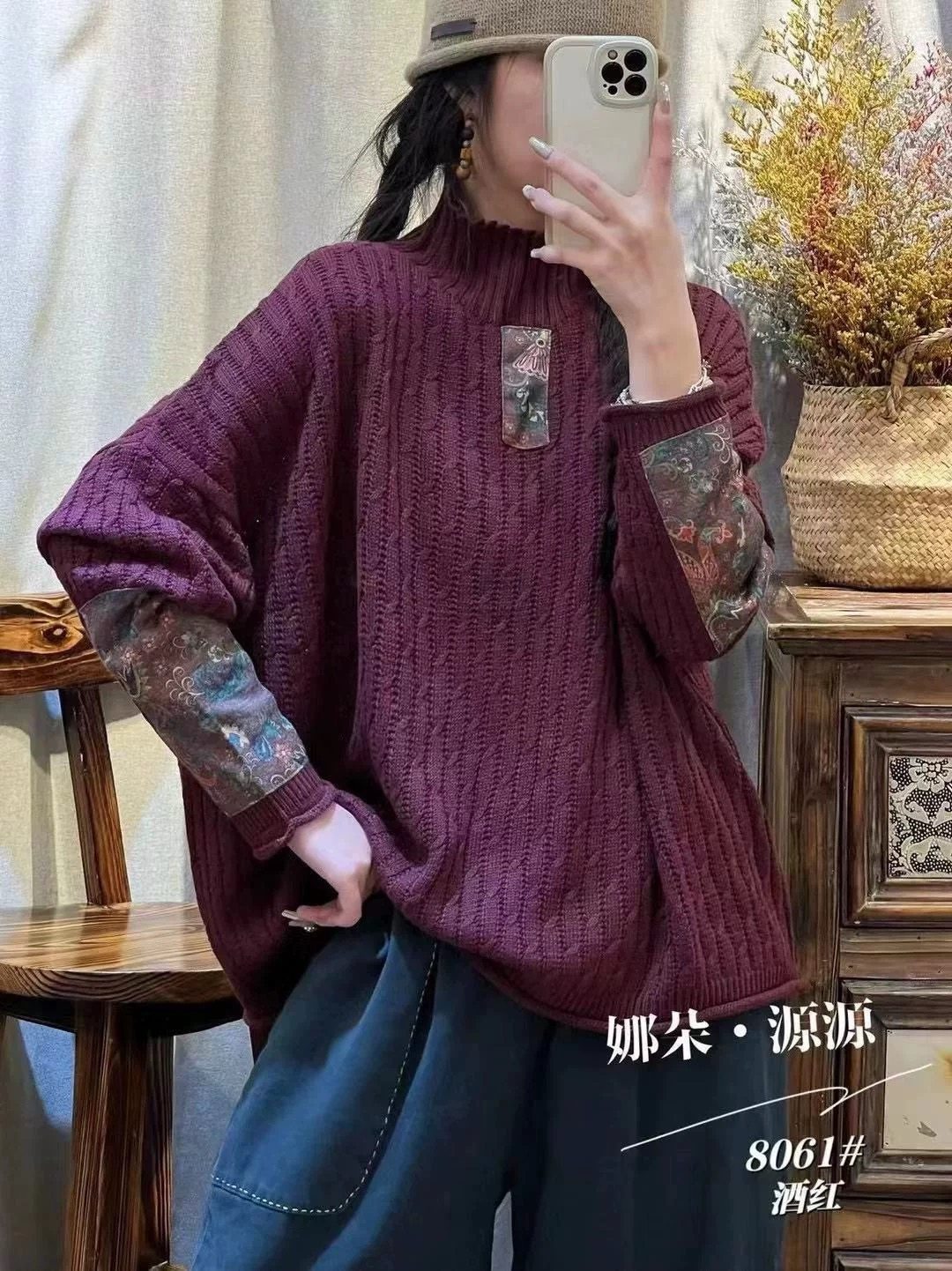 红色新款纯棉线女装半高领毛衣宽松加厚针织打底衫复古风文艺休闲