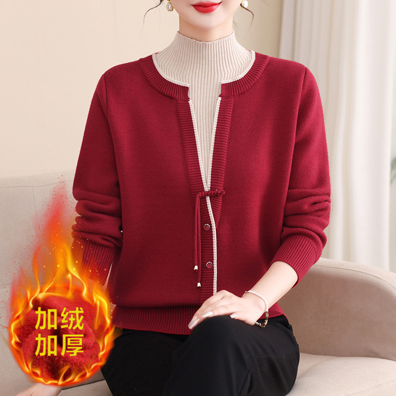 妈妈装冬装针织假两件上衣一体绒加厚打底衫中老年女装半高领毛衣