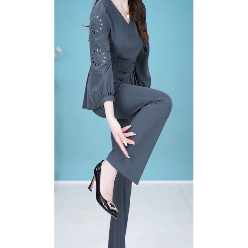 时尚职业套装女2024春季新款气质显瘦设计感镂空上衣阔腿裤两件套