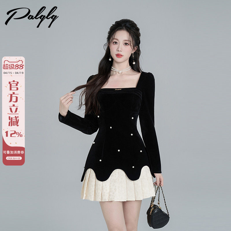 赫本风黑色方领丝绒连衣裙女冬季高级感千金风百褶a字生日小礼裙