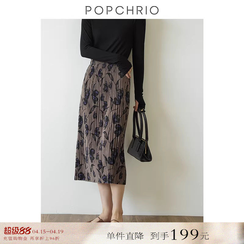 【到手199元】原创印花百褶高腰丝绒半身裙显瘦a字长裙伞裙子女春