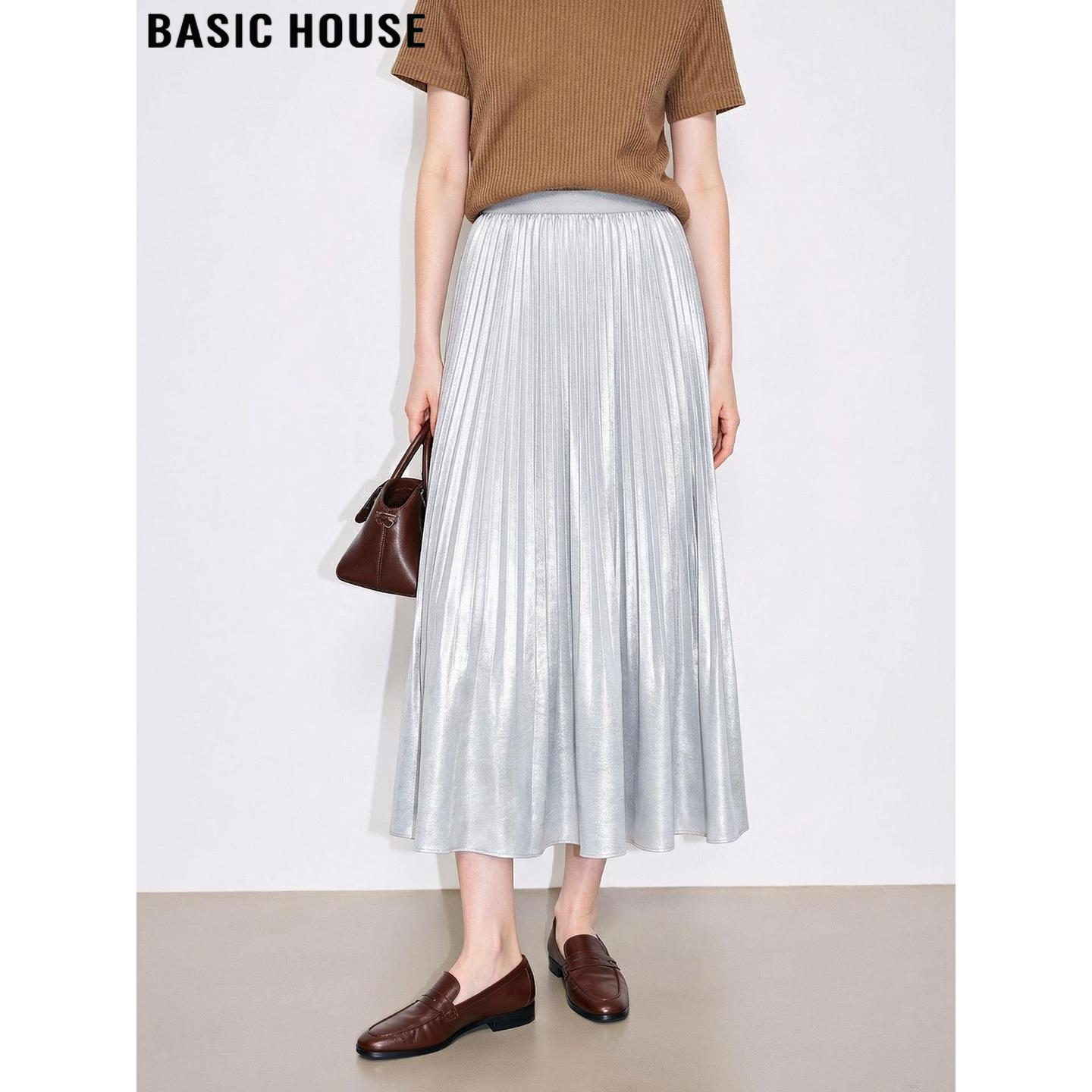 Basic House/百家好轻奢丝绒百褶半身裙女2026夏季新款高腰中长裙