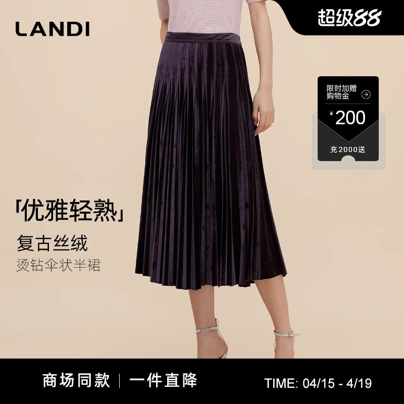 [商场同款]优雅轻熟LANDI凝夜紫复古丝绒烫钻长款百褶半裙秋新品