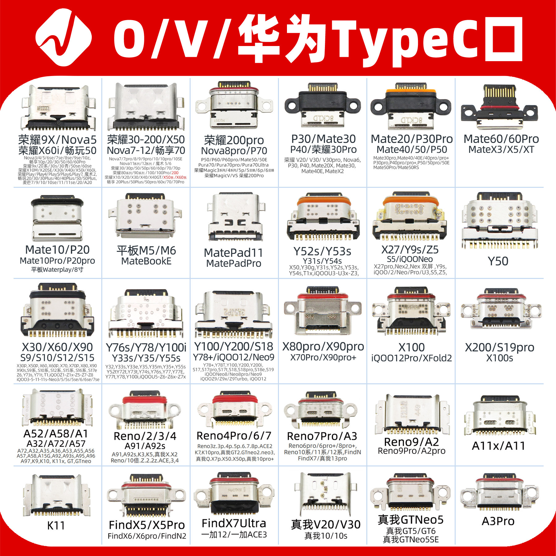通用百款型号常用手机尾插接口安卓V8口适用于VIVO华为OPPO充电口