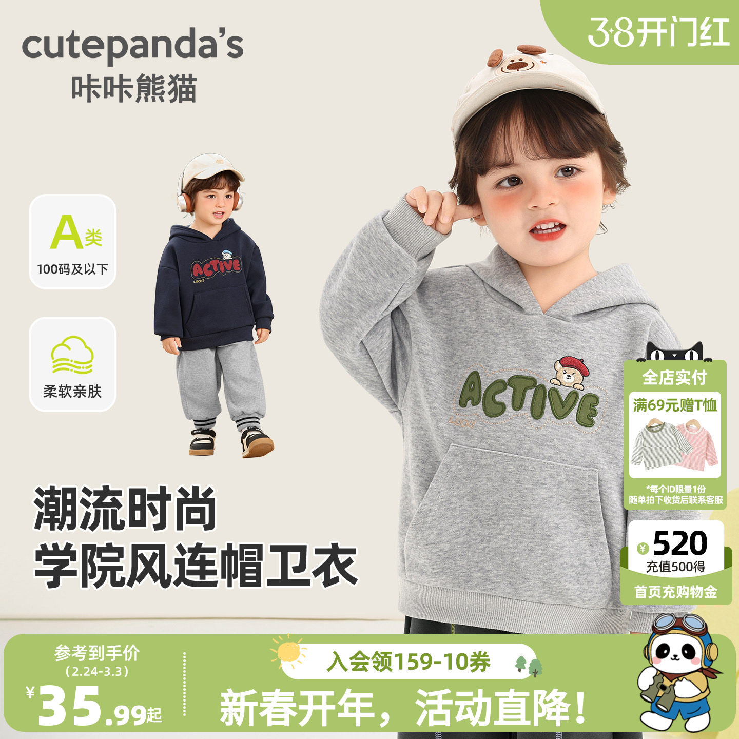 咔咔熊猫男童卫衣春季小孩炸街酷帅宝宝上衣2026新款衣服儿童童装