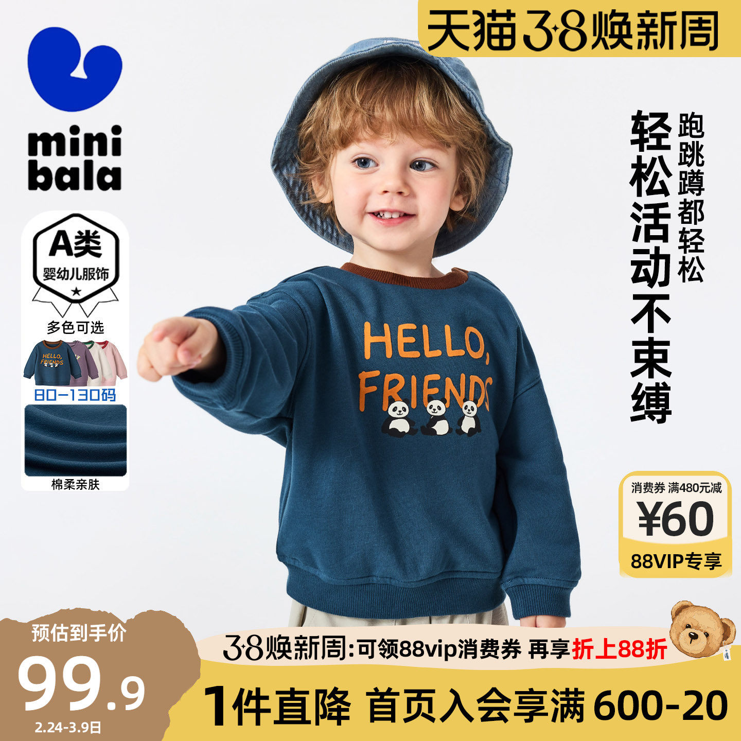 迷你巴拉巴拉男童宝宝卫衣儿童熊猫印花软糯有型圆领上衣春季新款