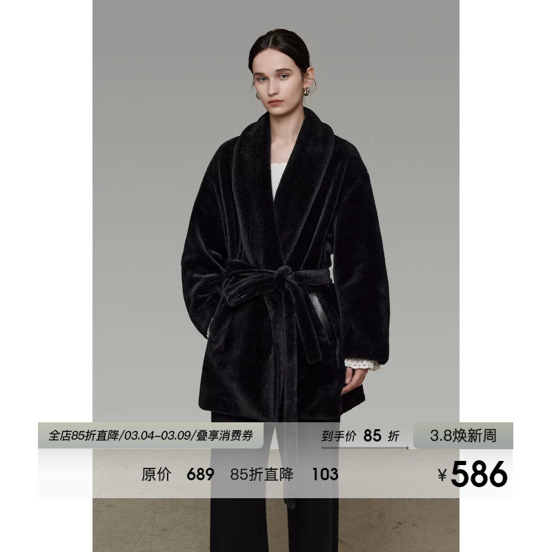 UNSPOKEN浴袍式V领系带中长款皮毛一体女冬季加绒环保仿皮草外套